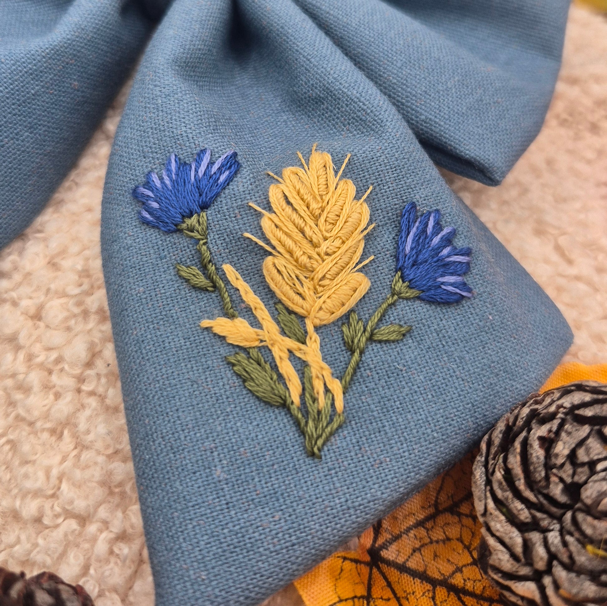 Petrol blue linen, hand embroidered with a bouquet of cornflowers and wheat.