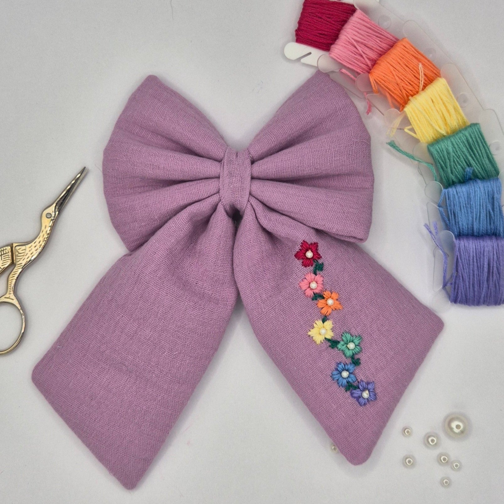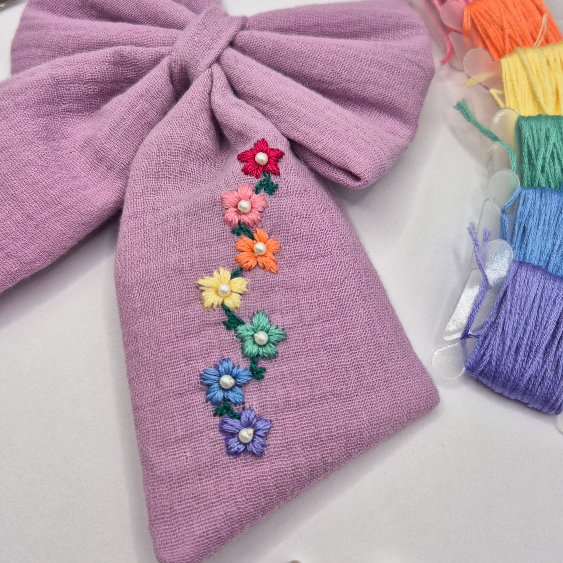 Lilac double gauze cotton, hand embroidered with a colourful rainbow flower chain. The centre of each flower contains a small pearl bead to add a little extra elegance. This bow has longer tails in each size