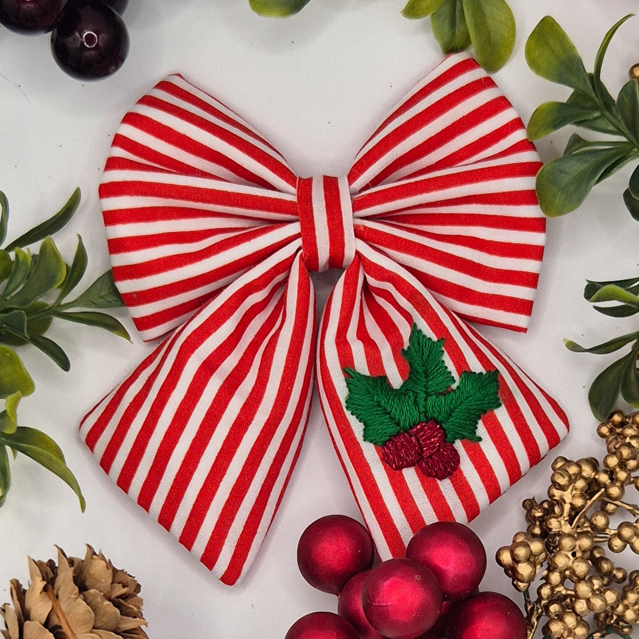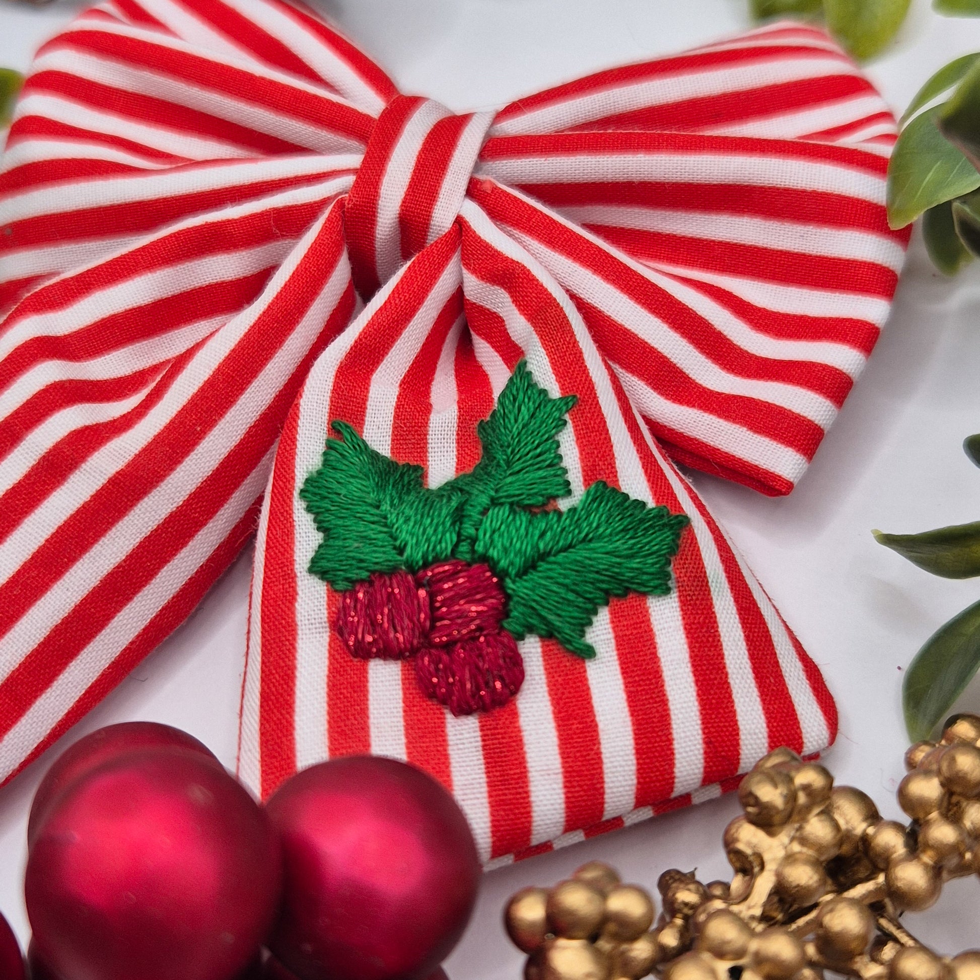 Red and white stripe cotton, hand embroidered with 3 holly leaves and berries