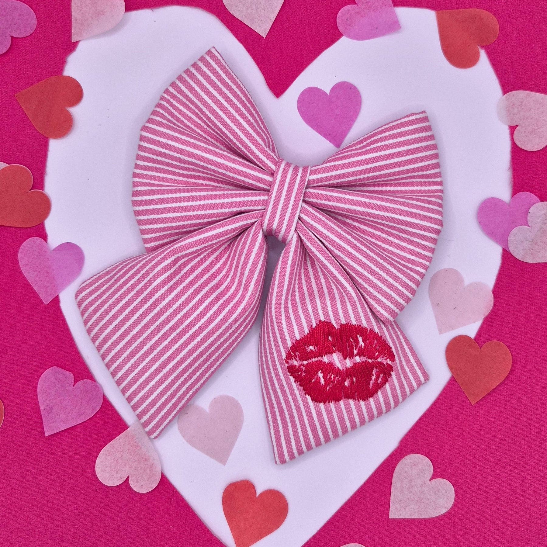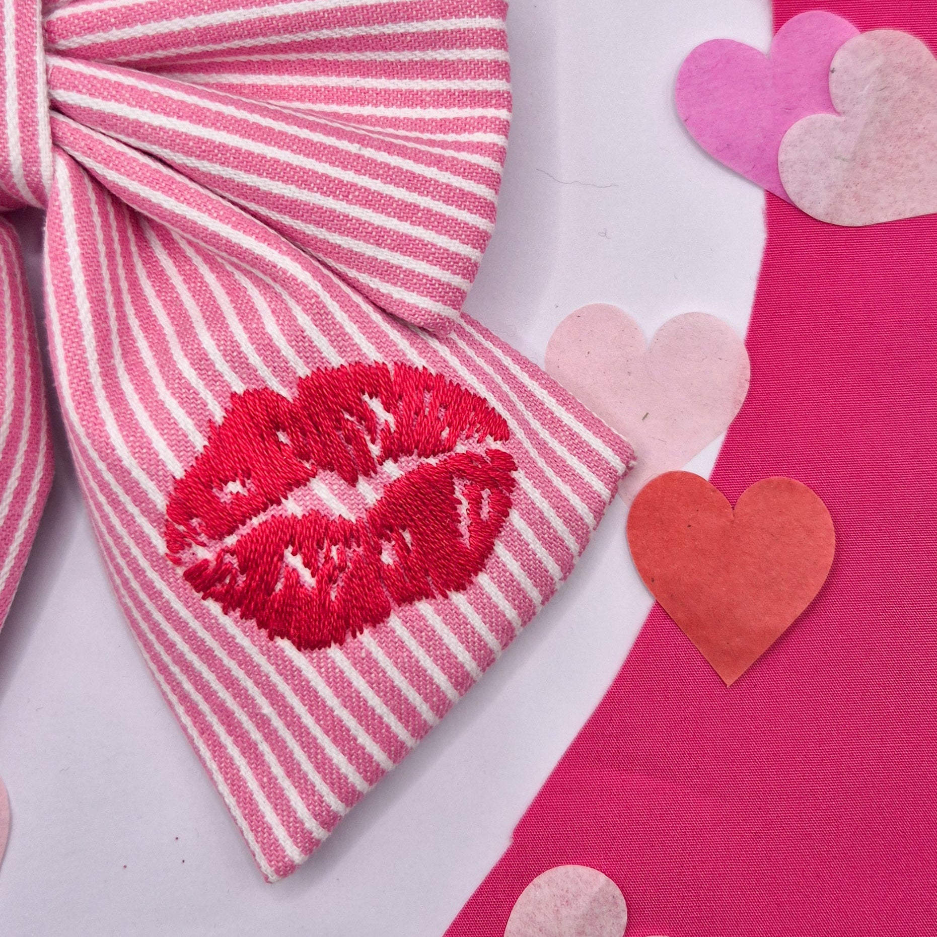 Pink chambray stripe denim fabric, hand embroidered with a bright red kiss. For a quirky valentines accessory.