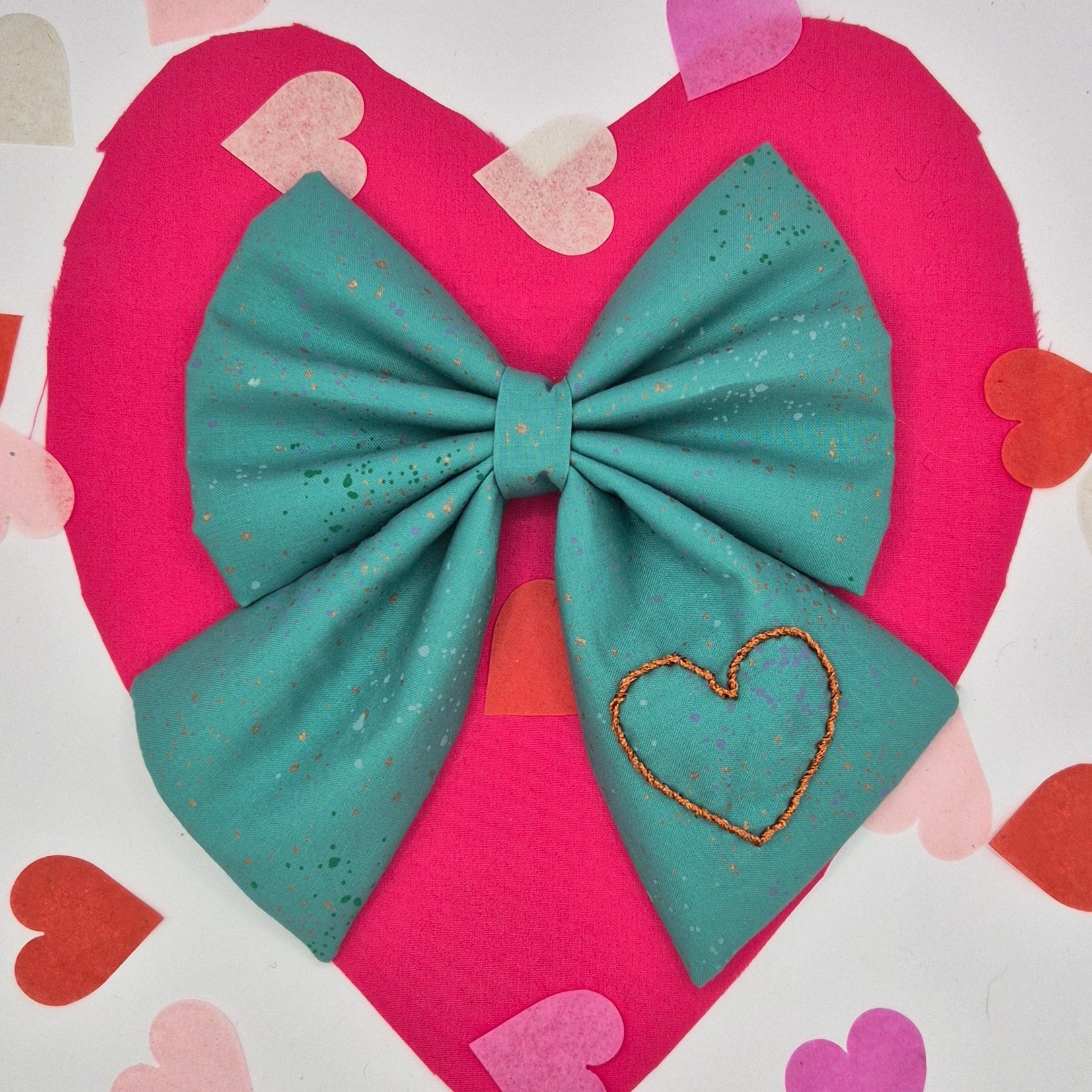 Jade green metallic speckled cotton hand embroidered with a copper metallic heart