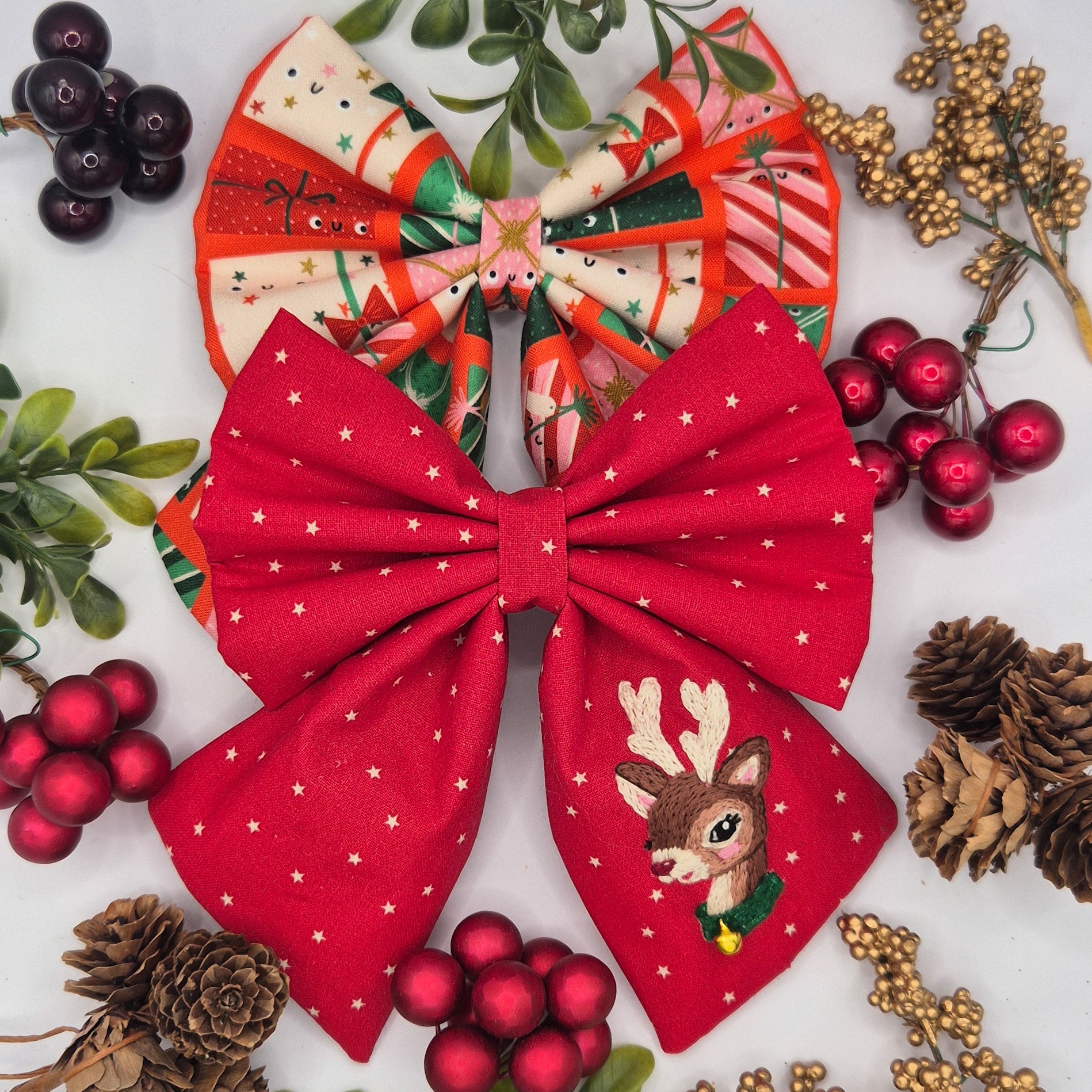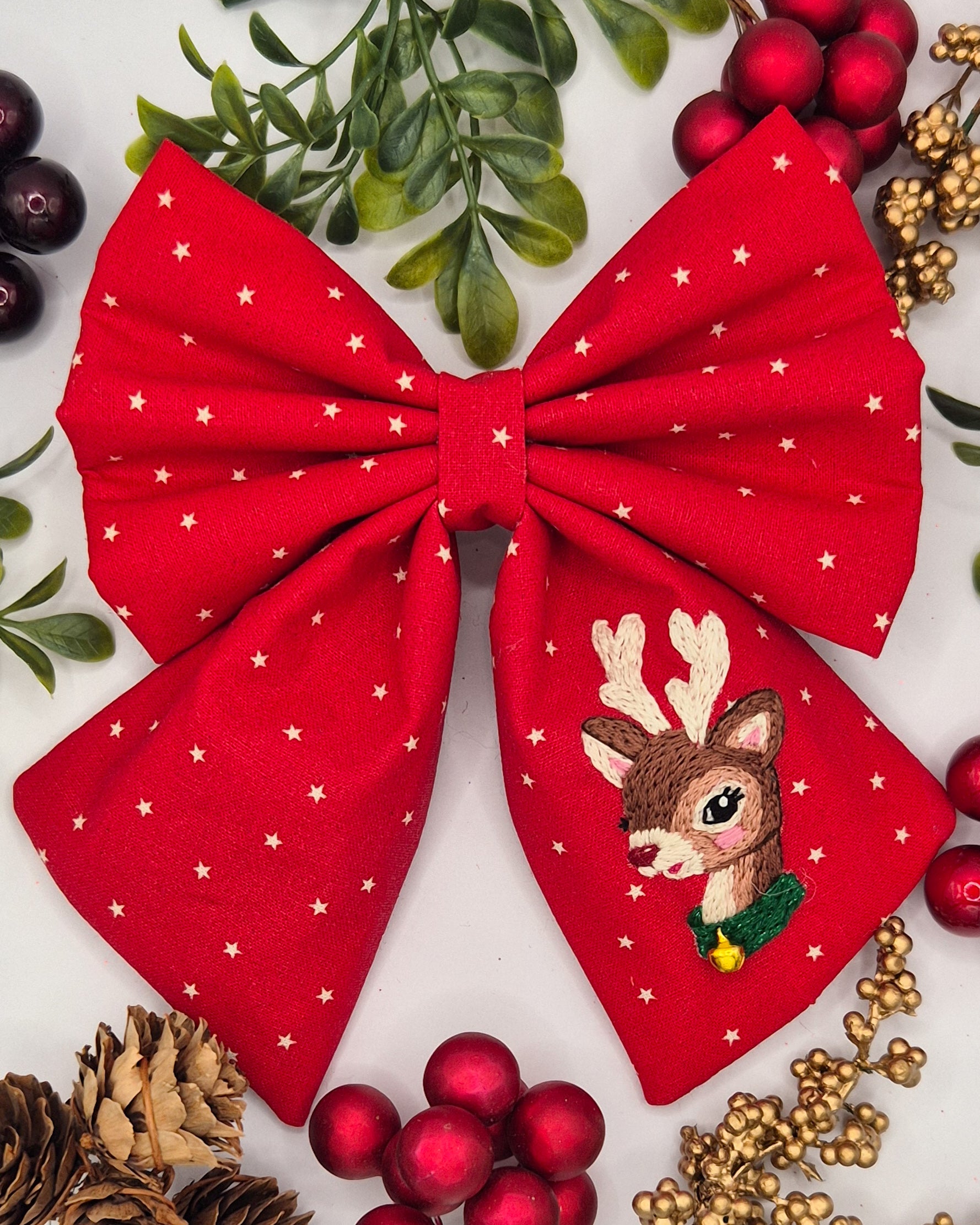 One beautifully embroidered reindeer bow on red star fabric, carefully hand stitched using DMC thread and a small Christmas bell.