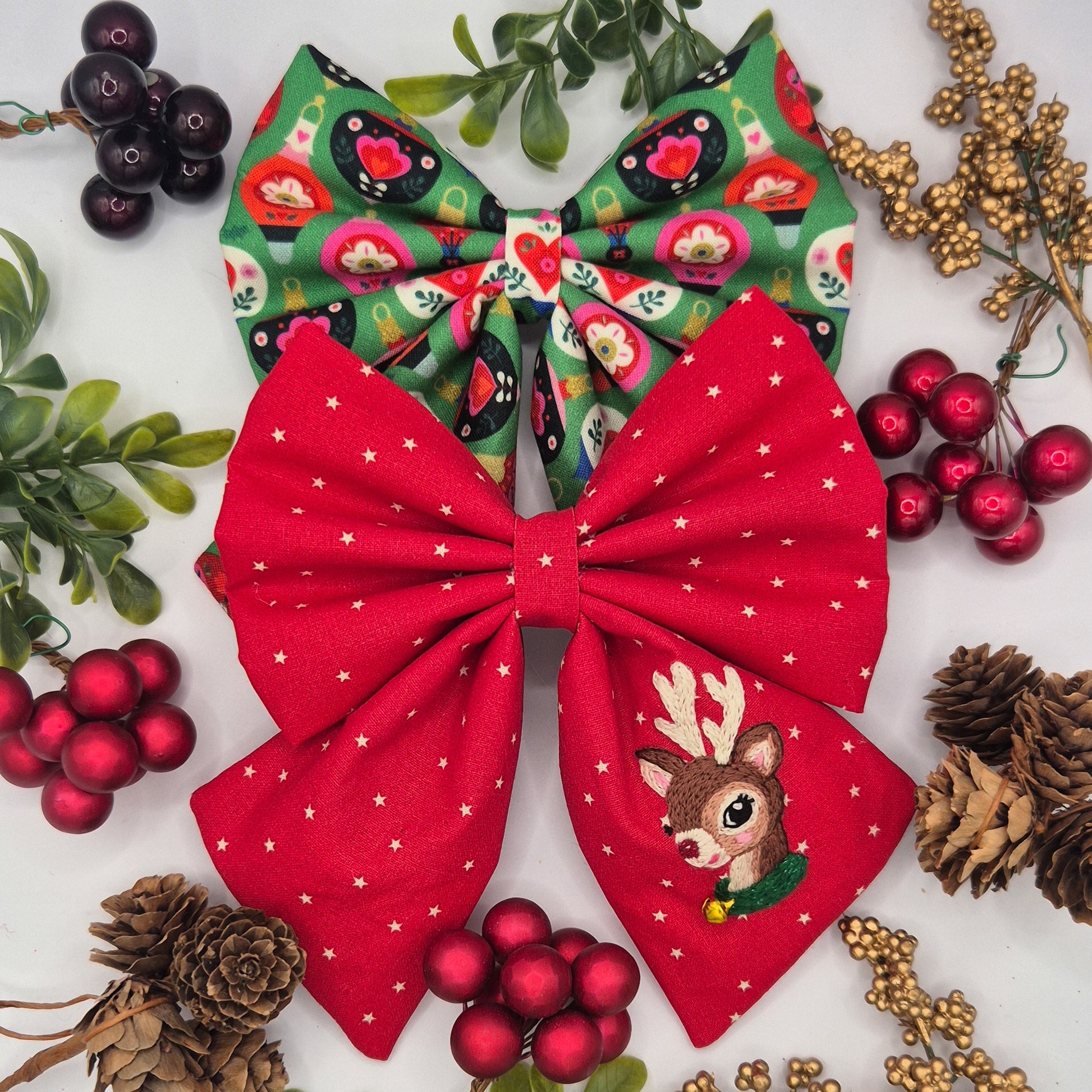 One beautifully embroidered reindeer bow on red star fabric, carefully hand stitched using DMC thread and a small Christmas bell.