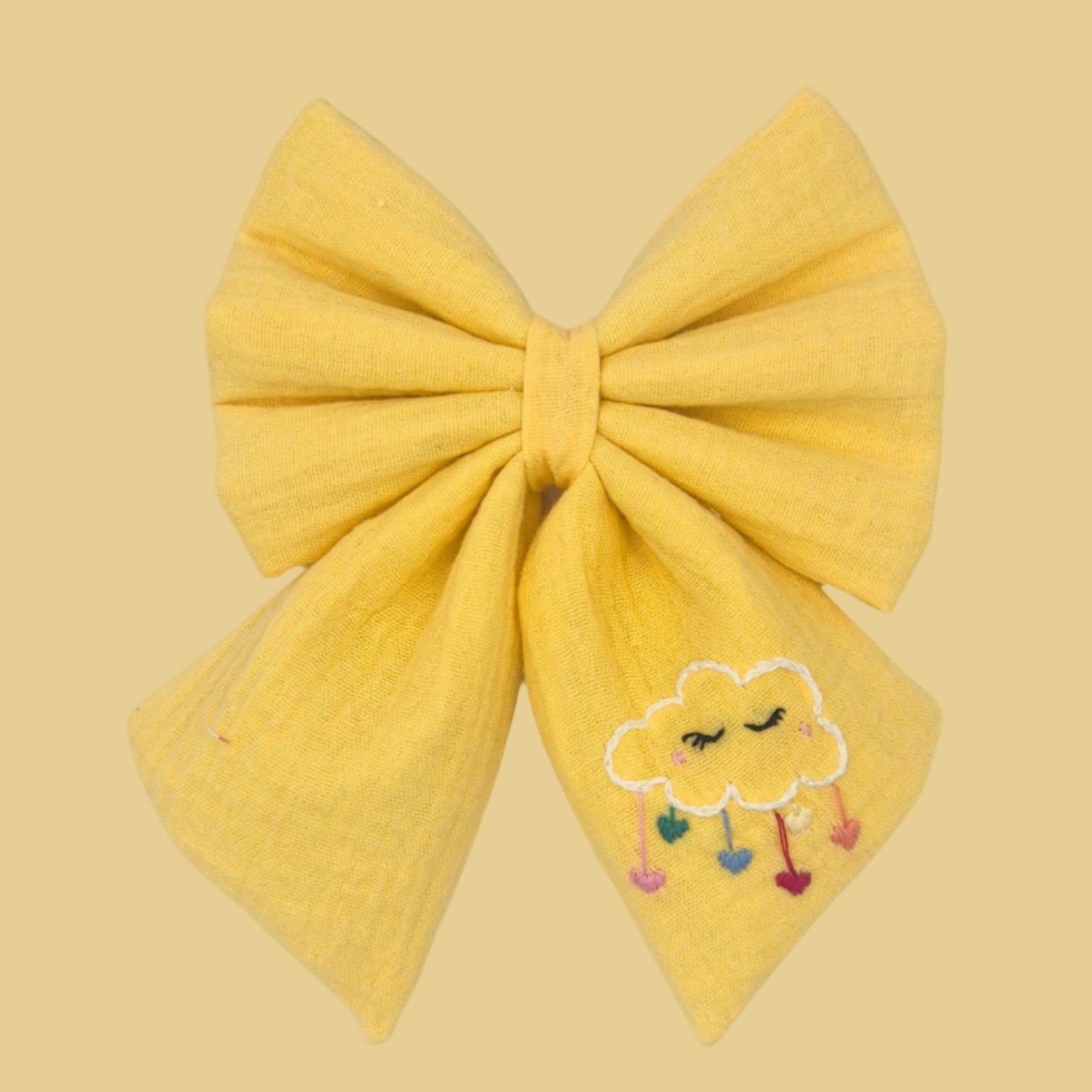 Lemon gauze cotton, hand embroidered with a cloud and heart shaped raindrops.