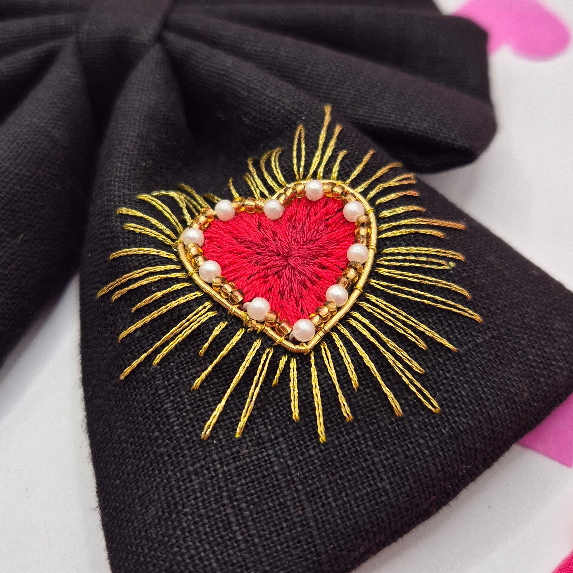 Black linen, hand embroidered using purl gold wire, pearls, seed beads as well as metallic and non metallic DMC thread. This bow is a true show stopper.