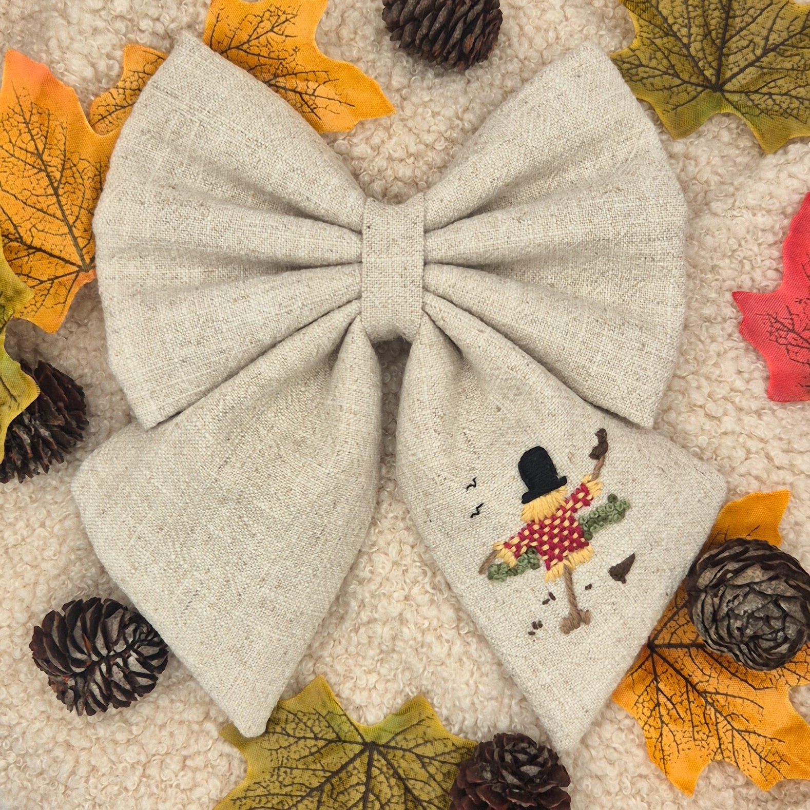 Neutral washed linen, embroidered with a scarecrow scene including a hedgerow and birds in the distance