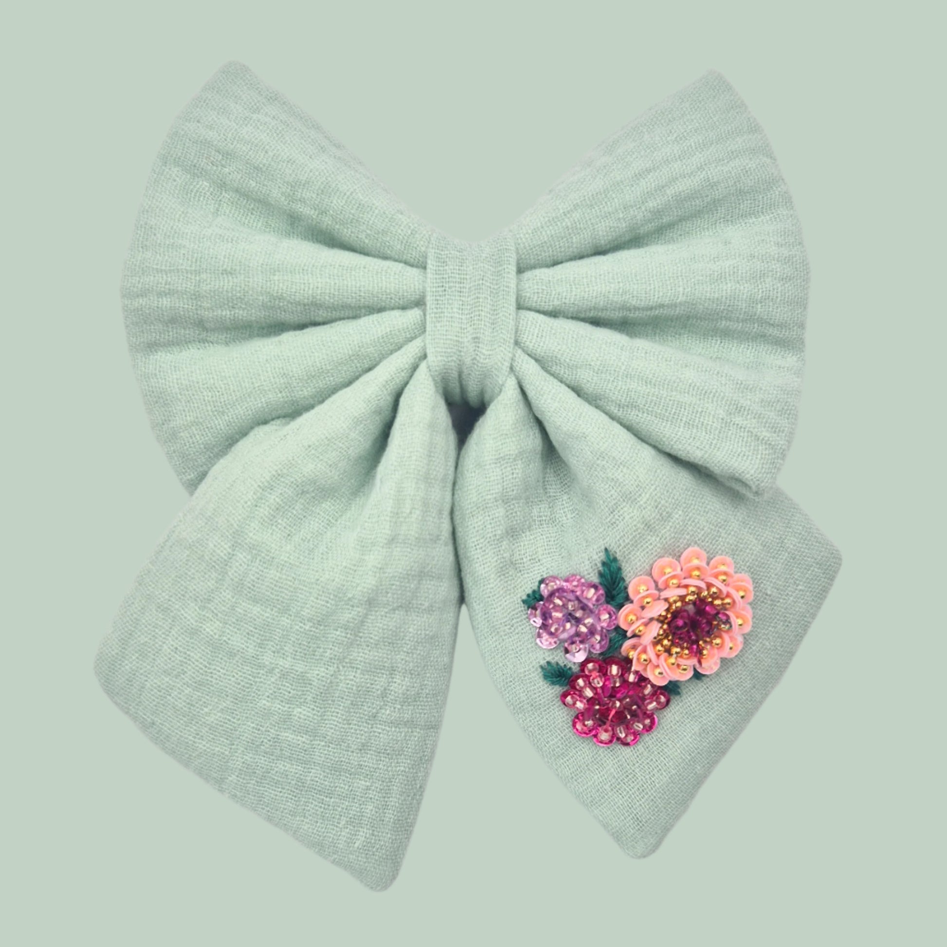 Mint double gauze cotton, hand embroidered using sequins and beads to create these stunning flowers
