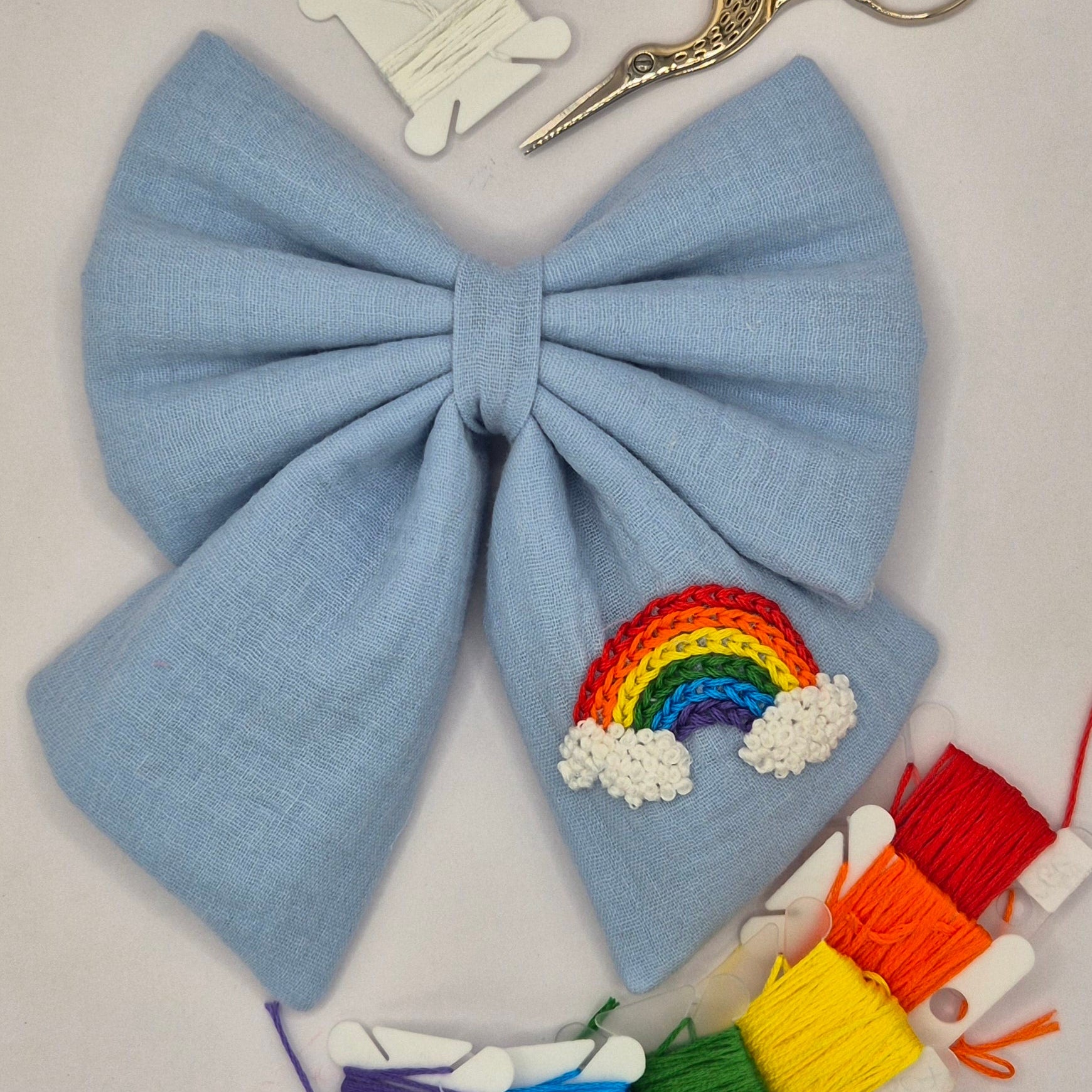 Sky blue double gauze cotton, lovingly hand stitched with a vibrant rainbow. Stitiched using the best DMC thread.