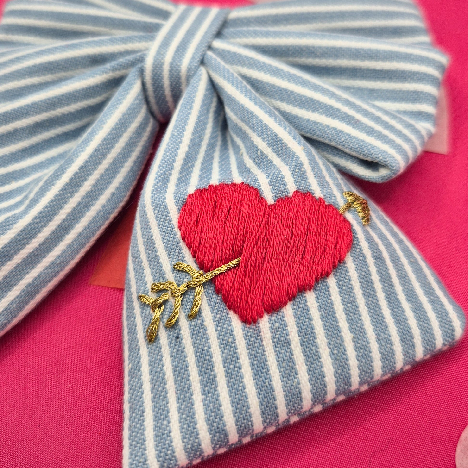 Blue chambray stripe denim fabric with a traditional heart and arrow hand embroidered.