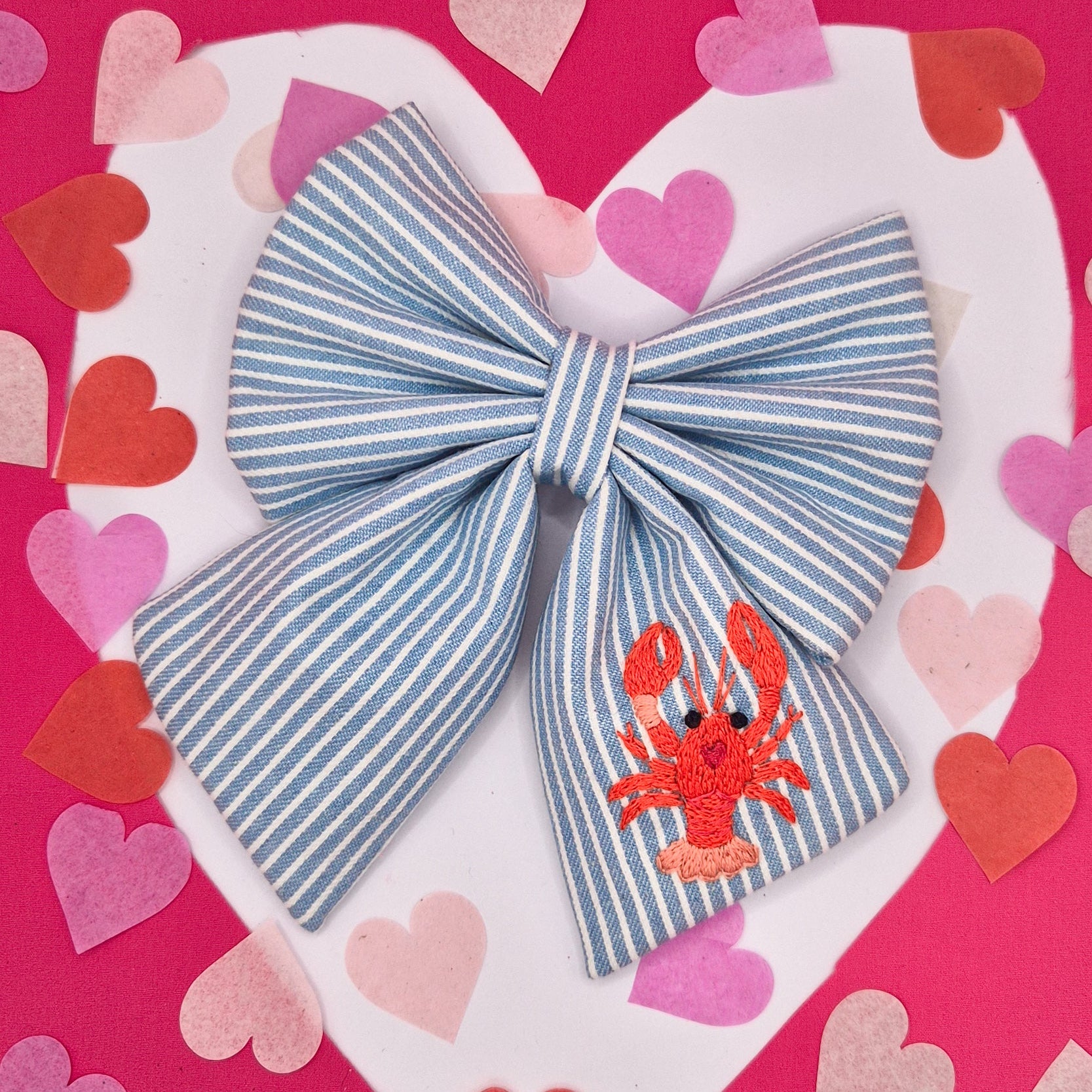 Blue chambray stripe linen, hand stitched using DMC thread a lobster as lobsters mate for life.